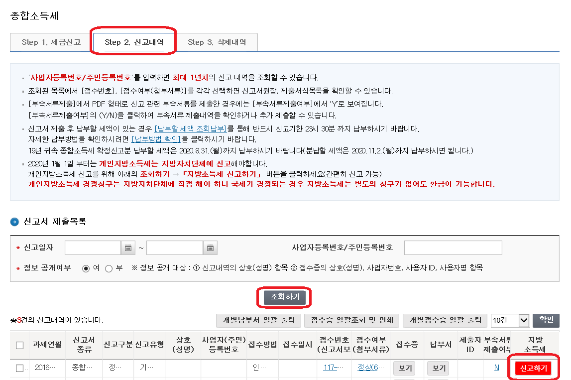 2. 신고서 제출목록을 조회한 다음,  지방소득세 - 신고하기 클릭
