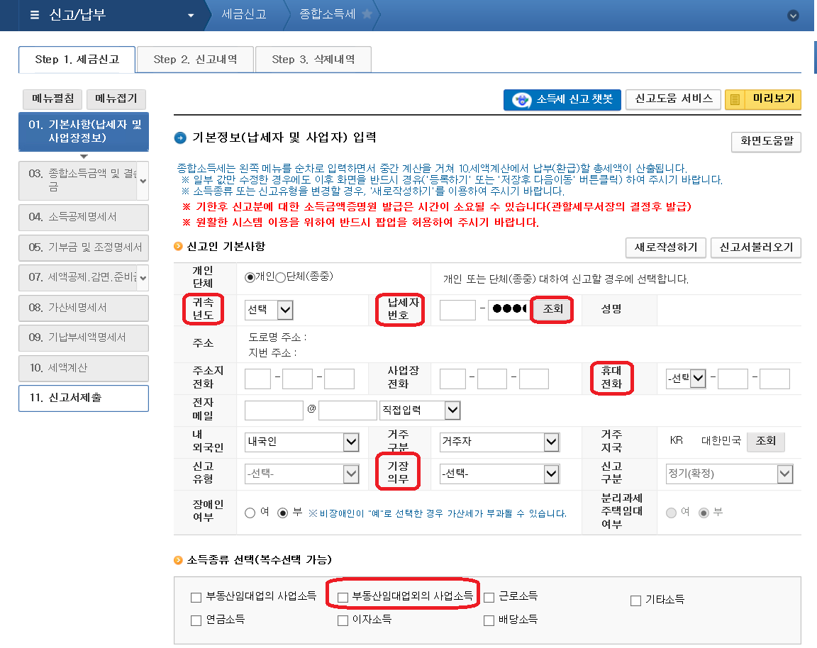 1. 상단의  [신고/납부] -> [세금신고] -> [종합소득세] 클릭