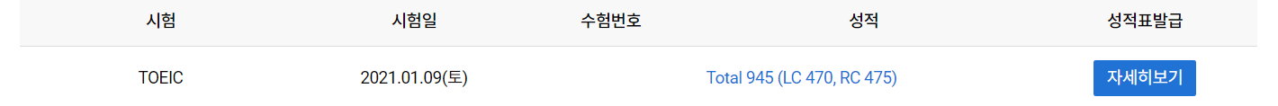 +) 1/9일 성적이 나왔다. 945점!! 성적 나오고 나서 2주간은 영단기 LC 와 ybm RC 1000제 1 을 하루에 하나씩 풀었다. 그리고 모르는 단어를 열심히 정리했다.