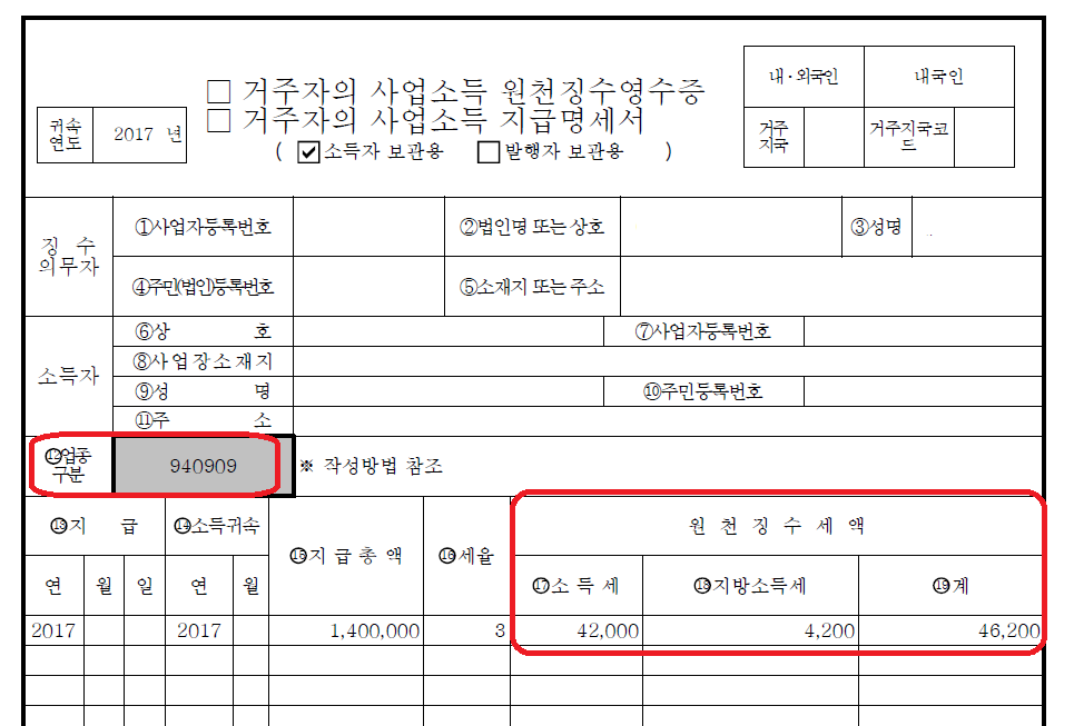 ( 앞서 조회했던 지급명세서에 나와 있던 업종 코드를 입력 )